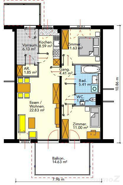 Schöne, gut geplante Wohnung in zweiter und somit ruhiger Lage mit Blick in ins Grüne. Zur Raumaufteilung: Vorraum mit Platz für eine Garderobe, geräumiger Abstellraum. Ins Wohnzimmer mit offener Küche (möbliert). Über die Zwischendiele ins Badezimmer (mit Wanne), und ins separte WC (mit Handwaschbecken), 2 Schlafzimmer. Vom Wohnzimmer und einem