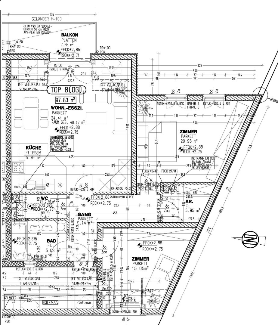 Auf einer Wohnfläche von ca. 95m² stehen das große Wohn/Esszimmer mit offen gehaltener, komplett eingerichteter Miele-Küche und Ausgang auf die ca. 7m² große Terrasse, zwei Zimmer, der Vorraum
