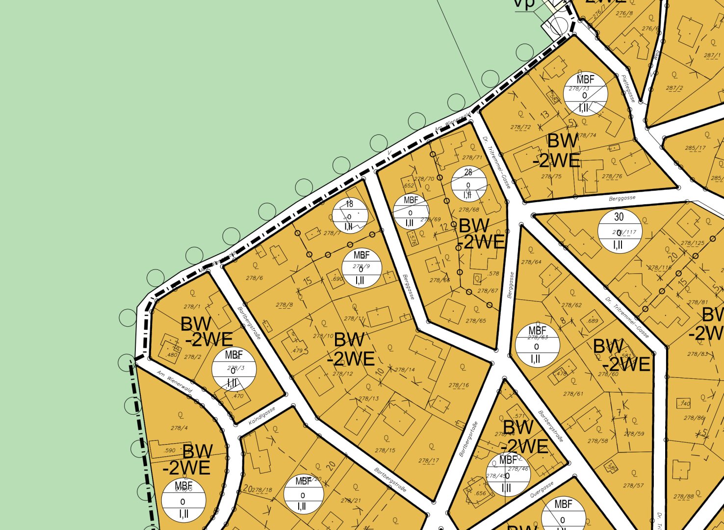 MBF Maximal Bebaubare Fläche: Hauptgebäude: 150 m2 + 4% jenes Teiles des Bauplatzes, der gemäß Bebauungsplan in der Festlegung