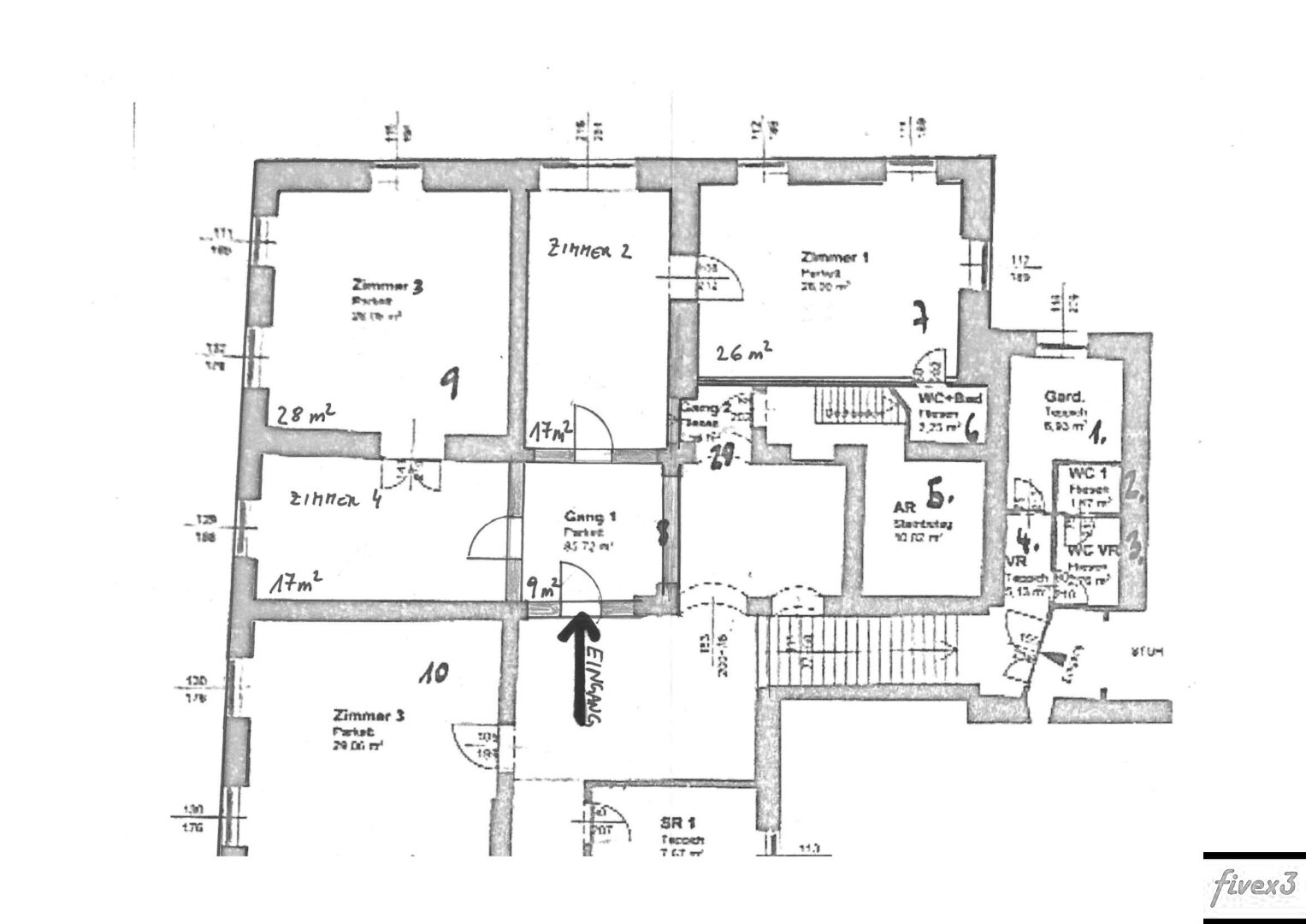 Zu mieten ist ein Teil des ersten Obergeschoßes mit 4 Räumen (ca. 28, 26, 17 und 17m²), ein Vorraum mit rund 9m² und WC 2m²; es stehen hier weitere