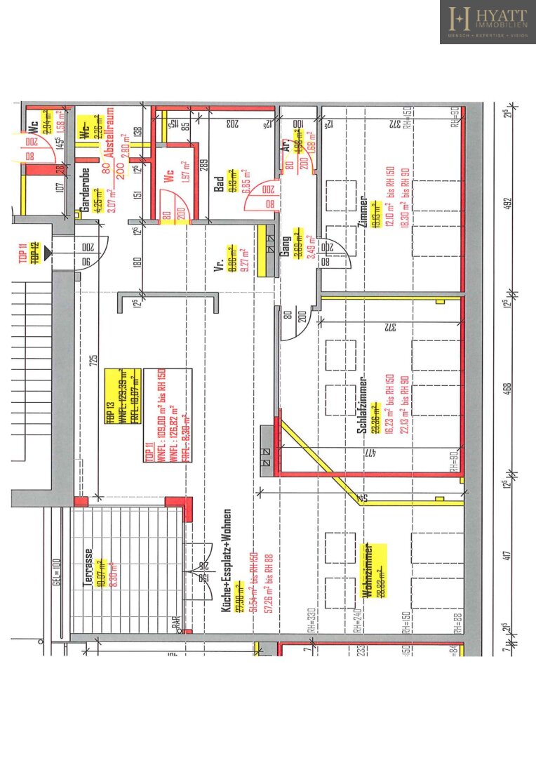 Man betritt die Wohnung über ein zentral gelegenes Vorzimmer mit rund 9,27 m², das eine einladende Eingangssituation schafft und den Zugang zu allen Bereichen der Wohnung ermöglicht. Rechterhand gelangt man in den großzügigen Wohn- und Küchenbereich, der laut Plan 57,26 m² umfasst und mit seiner offenen Struktur viel Raum für