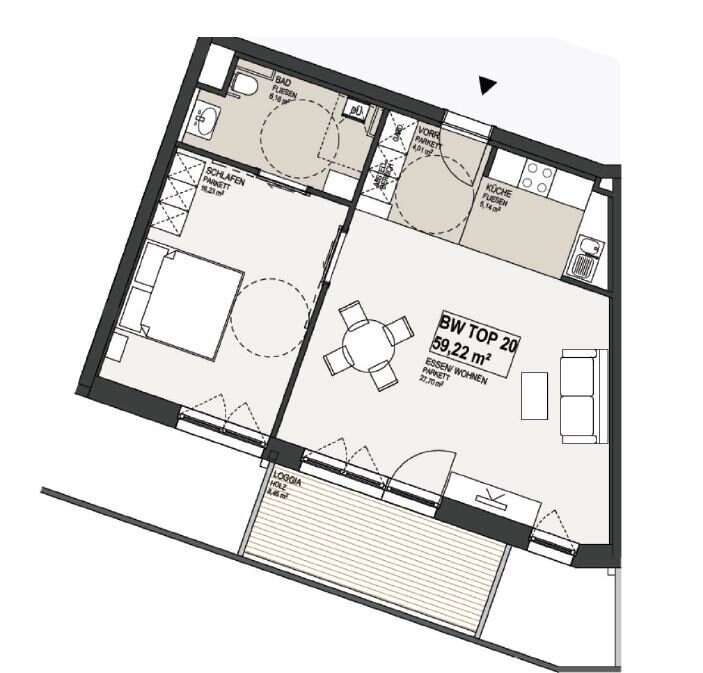 Mit einer großzügigen Fläche von 59,22 m² überzeugt die Wohnung durch einen durchdachten Grundriss, der Ihnen viel Platz zum Entspannen