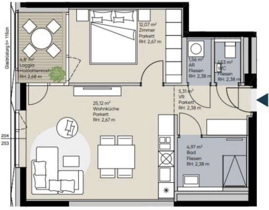 Top 106 ist klar und smart aufgeteilt: vom Vorraum aus gelangen Sie in das Badezimmer, das separat gelegene WC sowie in den Abstellraum. Der Vorraum verbindet den Eingangsbereich mit dem luftigen, lichtdurchfluteten Wohnzimmer, in dem sich eine hochwertige