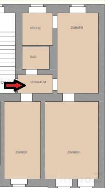 Vorraum, Badezimmer mit WC, Dusche und Waschmaschinen-Anschluss, Wohn-/Esszimmer (= Durchgehzimmer) zur Arbeitsküche und zwei separat begehbare Schlafzimmer (eines vom Wohnzimmer und das zweite vom Vorzimmer). Ein Büroaufwand in der Höhe von 1 x Euro 150,- ist an die Hausverwaltung zu bezahlen.