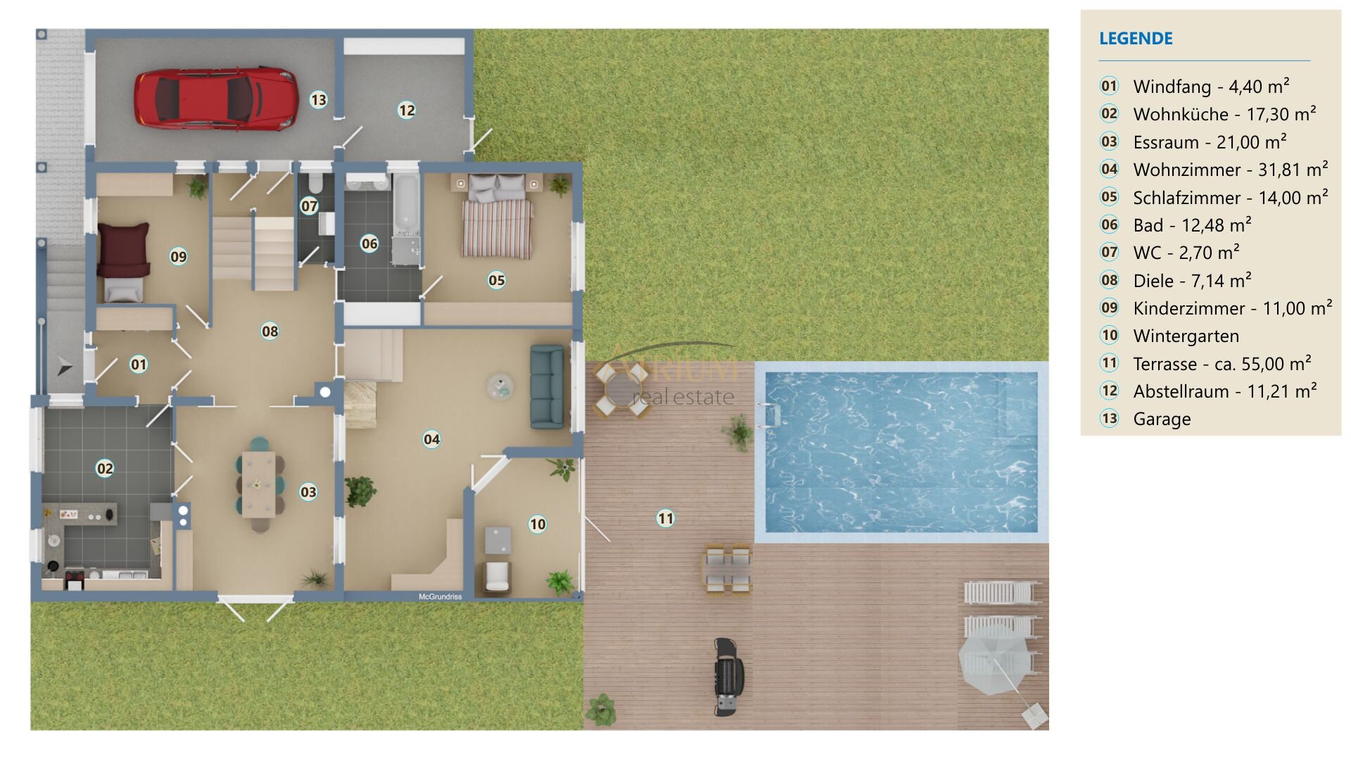 Auf einem 684m² schönem Grundstück befindet sich dieses zweistöckige 240m² Traumhaus mit Terrasse, Garten, Pool und Garage.
