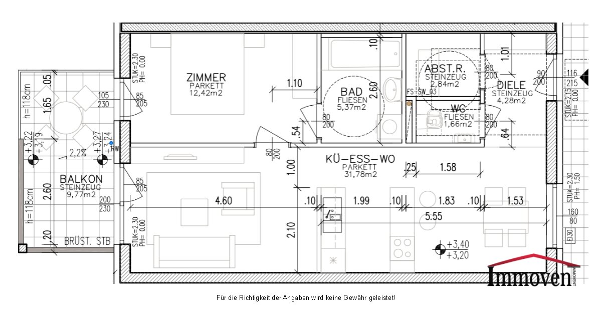 + Wohnraum mit integrierter Küche und Zugang auf den Balkon