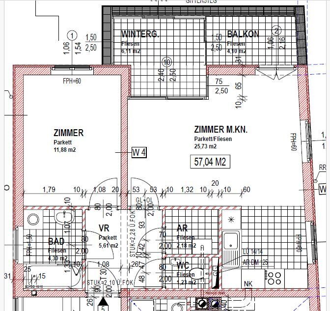 Die Wohnung hat 57,04 m2 an Wohnfläche und gliedert sich folgendermaßen auf: Vorraum, Abstellraum, separates WC, Badezimmer mit Wanne und Dusche; Küche, Wohnzimmer, Schlafzimmer, Wintergarten mit 6,10 m2 und zusätzlich ein Balkon mit 4,1 m2