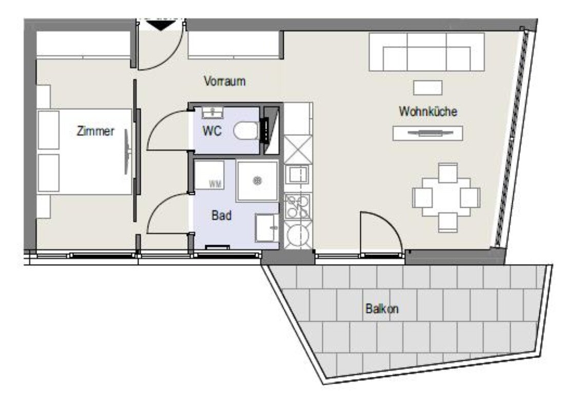 Die Wohnung hat knappe 44 m2 an Wohnfläche plus Balkon