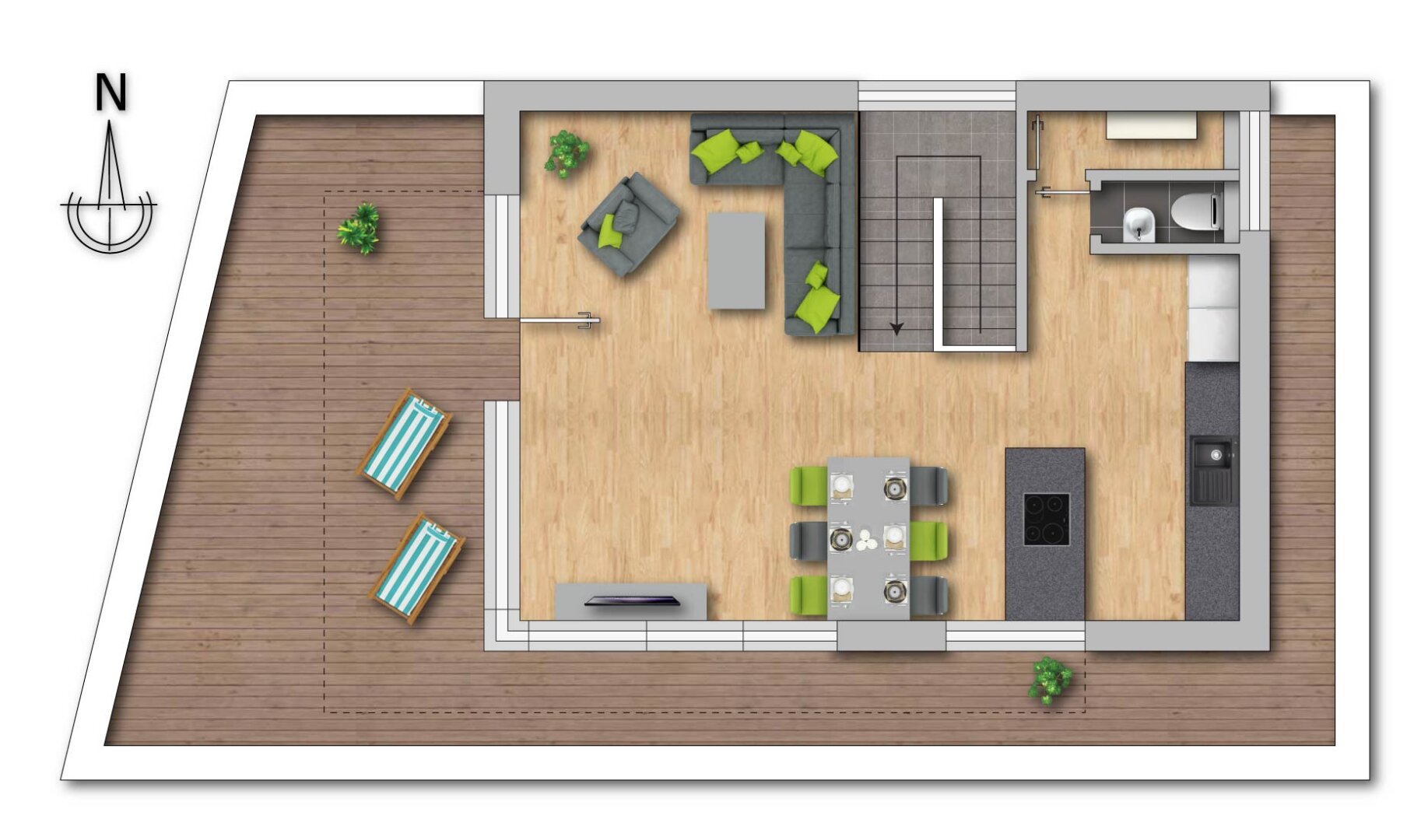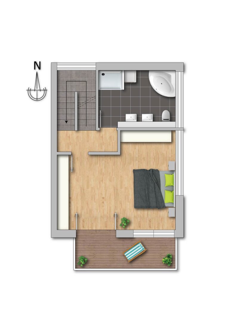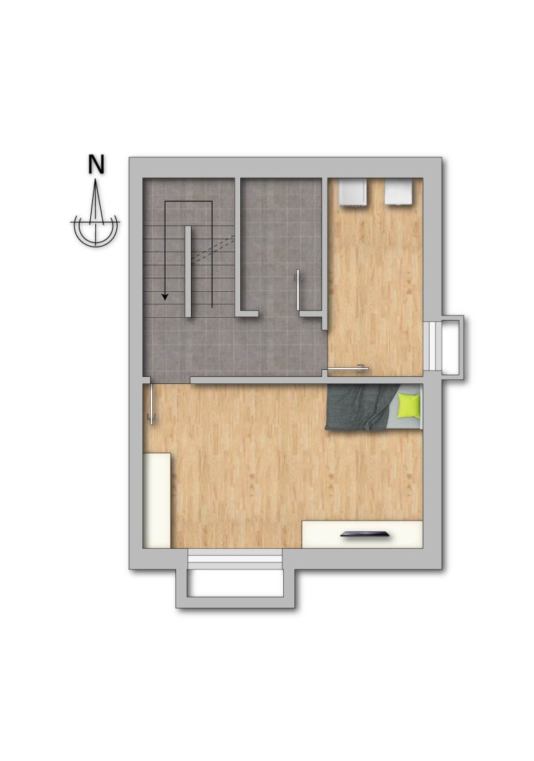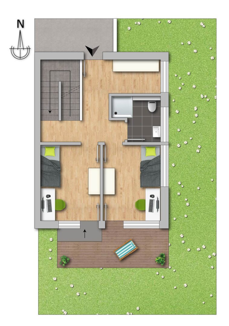 Im Erdgeschoss befinden sich zwei helle Schlafzimmer mit direktem Zugang zur Terrasse und zum