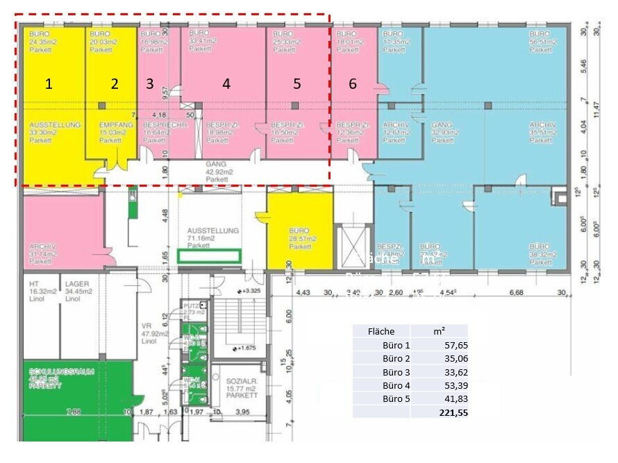 Zur Vermietung gelangen Büroflächen in verschiedenen Größen von ca. 35m² bis 220m². Die Räumlichkeiten sind zentral begehbar. Die Büros sind mit einem Parkettboden ausgestattet und lichtdurchflutet. Stellplätze – je nach Verfügbarkeit – können zusätzlich angemietet werden. Weiter sind ein Schau- bzw. Konferenzraum – nach Absprache – nutzbar. Der angegebene Preis