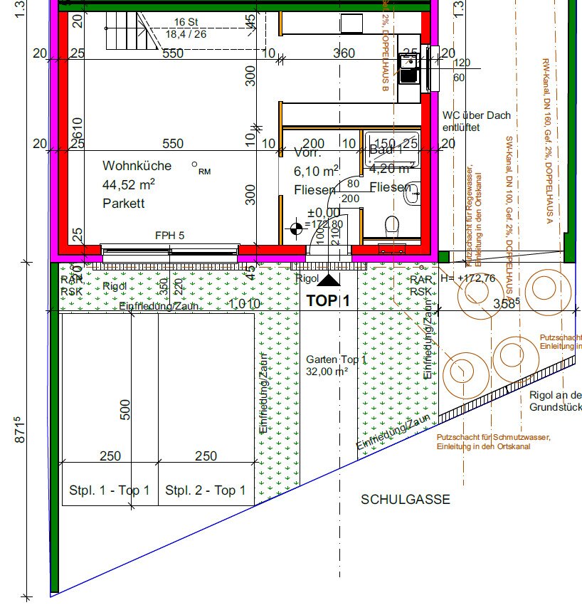 bestehend im Erdgeschoß aus: Vorraum, WC mit Handwaschbecken und Dusche, Wohnküche