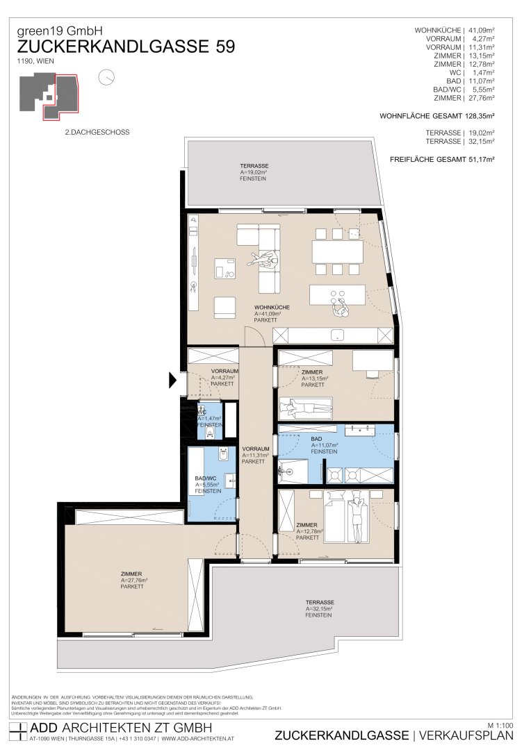 3 gentrennt begehbare Schlafzimmer (zwei davon mit direktem Zugang auf die 32 m² große Terrassen), eine großzügige Wohnküche mit eigener 19 m² großer Terrasse,