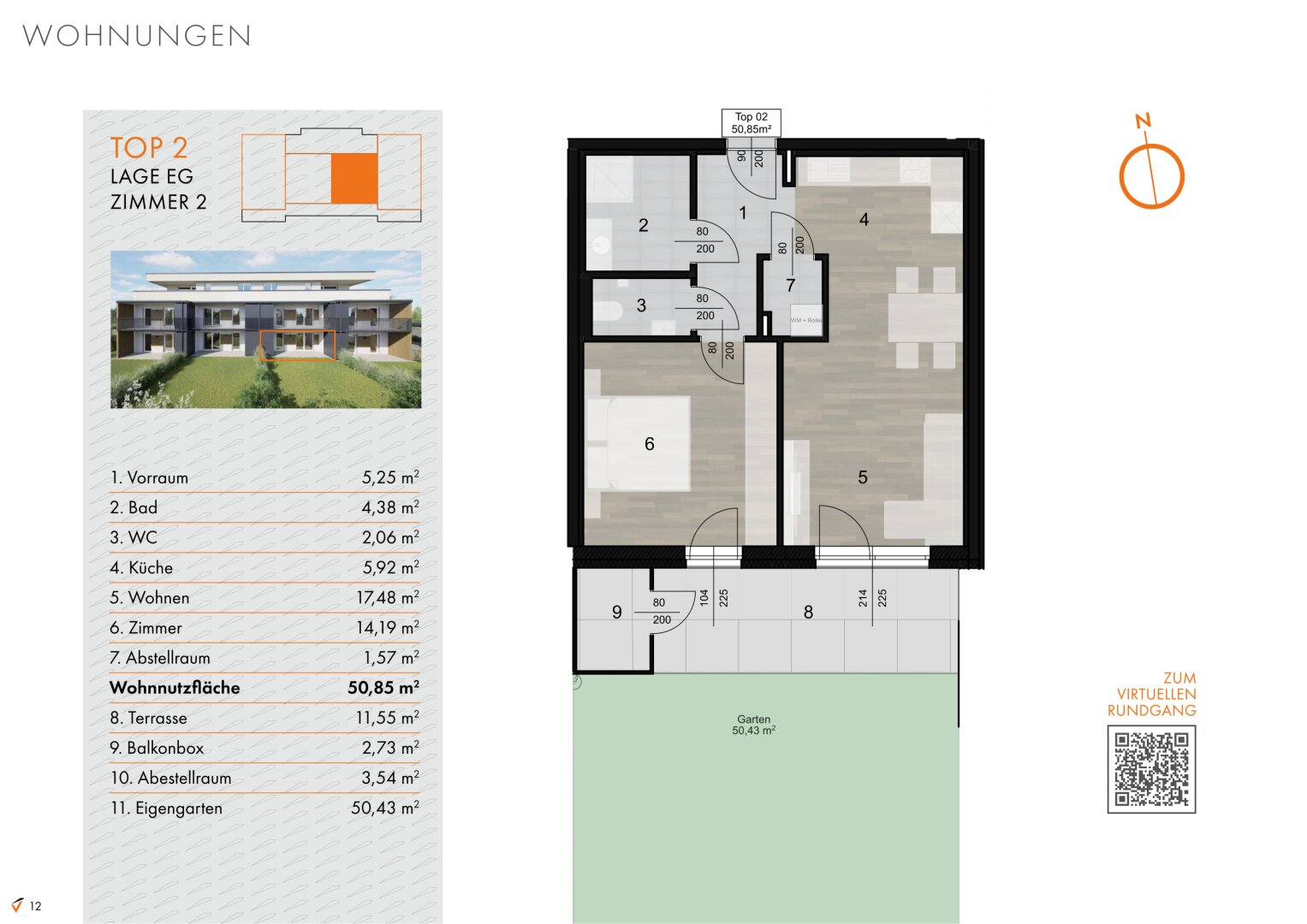 Diese 2-Zimmer-Eigentumswohnung im Erdgeschoss verfügt über eine Wohnfläche von ca. 50,85 m² sowie eine Terrasse mit ca. 11,55 m² und einen Eigengarten mit ca. 50,43 m².