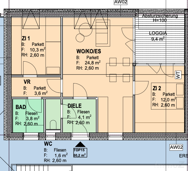 Die Top 15 teilt sich wie folgt auf: Diele, Bad, WC, Wohn/Kochen/Essen mit ca. 24,8 m2 und Zugang zur Loggia, sowie 2 extra Zimmer.