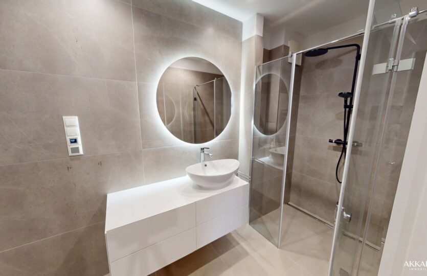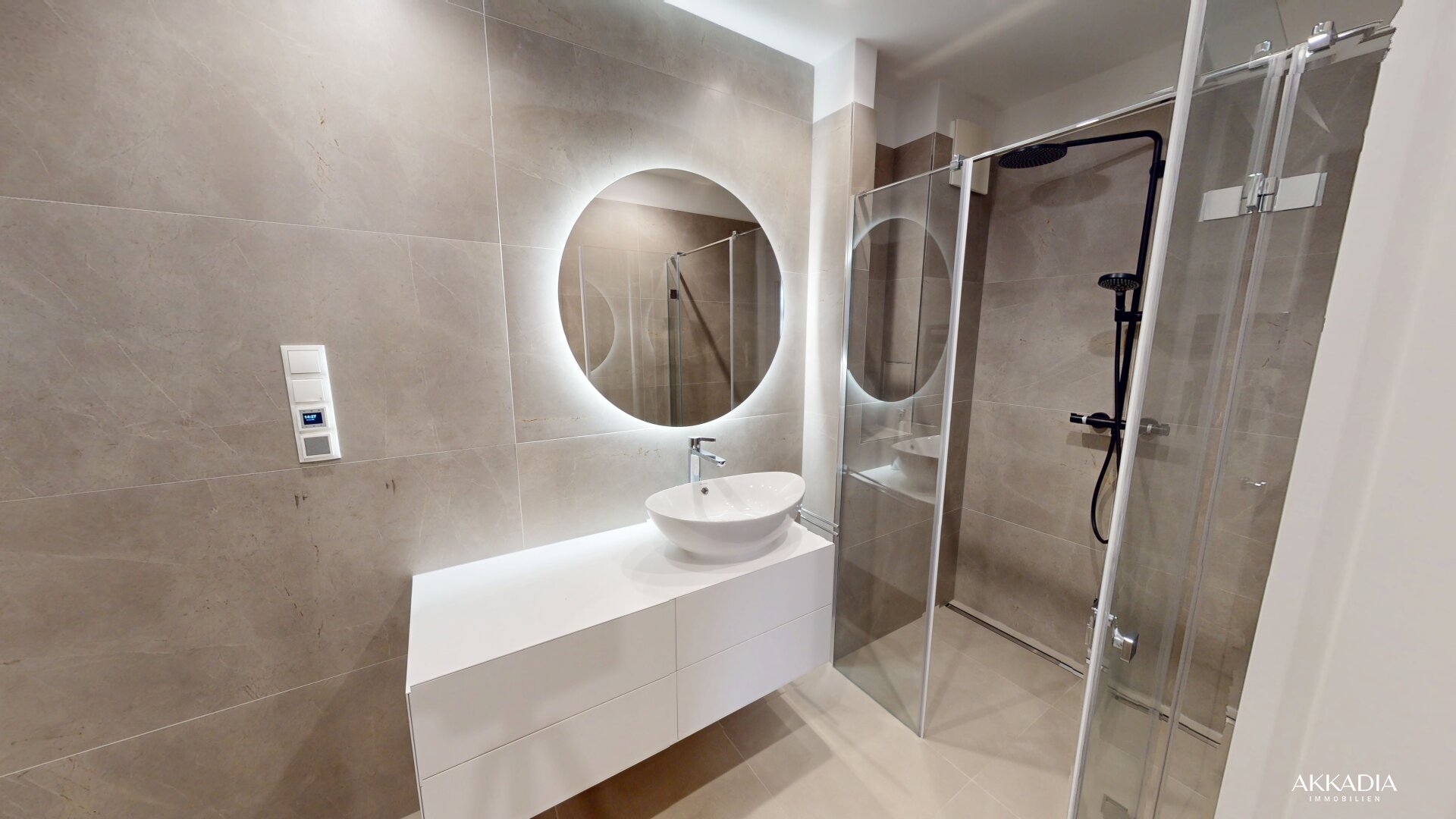 Die Wohnung ist inklusive aller Nassräume vollständig barrierefrei gestaltet, ausgenommen die über Stufen erreichbare Terrasse. Vom Vorraum aus sind das Badezimmer, das