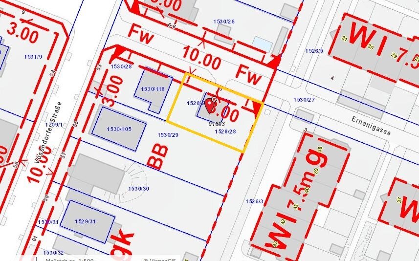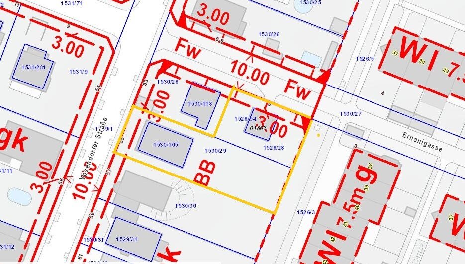 Dieses Grundstück ca.593 qm befindet sich auf einem Grund der als Wohngebiet (W/ (ogk)) gewidmet ist, siehe F+B. Ein Gebäude(Altbestand) ist
