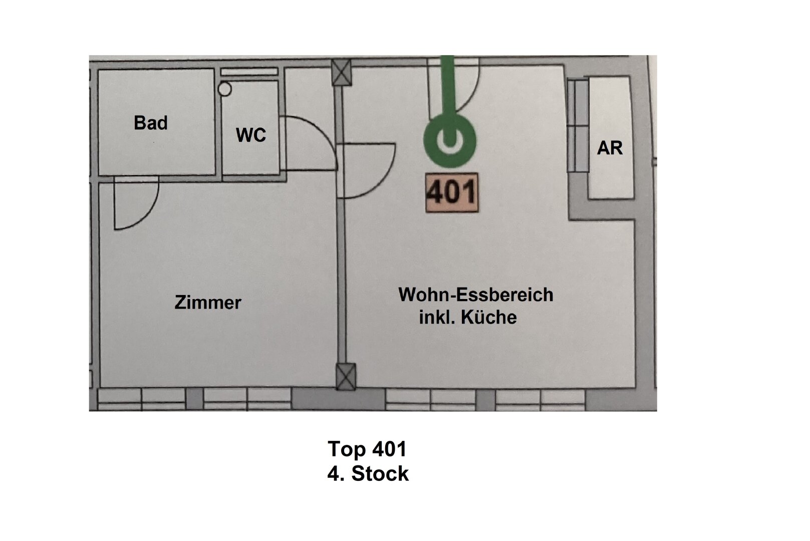 Aufgeteilt ist die Wohnung in einen Wohnraum mit Essplatz und Küche, ein Schlafzimmer, ein Bad mit Dusche und WC und einen Vorraum.