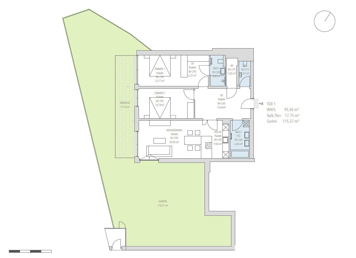 Die rund 95m² große Gartenwohnung verfügt über eine knapp 21m² große Wohnküche, 2 Schlafzimmer, 2 Bäder, einen Abstellraum sowie über einen geräumigen Vorraum und eine separate Toilette. Die knapp 18m² große Terrasse kann praktischer Weise über jeden Wohnraum betreten