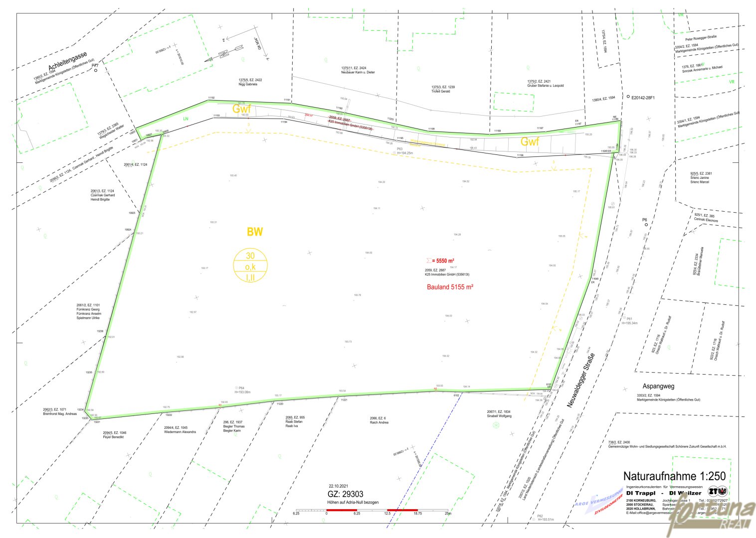 Das Grundstück befindet sich in Königstetten und hat eine Größe von 5590 m². Es wurde eine Bebauungsstudie erstellt, die 58 Wohnungen sowie eine Tiefgarage mit 91 Stellplätzen umfasst. Die Wohnnutzfläche beträgt 3173 m²-