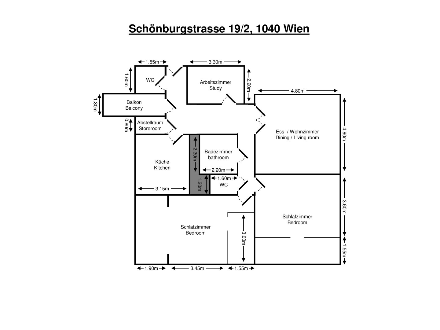 Der Vorraum geht in einen L-förmigen Korridor über. Alle Zimmer sind zentral begehbar.