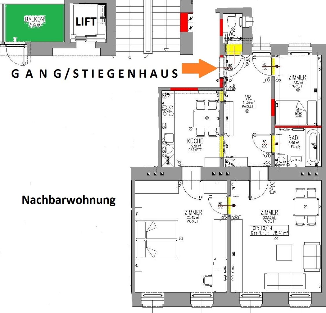 Der Wohnung ist auch ein Balkon zugeordnet, der nur über das Stiegenhaus begehbar – aber exklusiv für diese Wohnung – zur Verfügung steht.