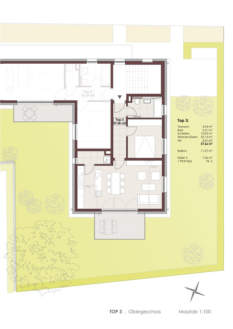 Die Wohnung befindet sich im ersten Obergeschoss eines neu errichteten Gebäudes mit nur fünf Wohneinheiten. Über den Flur sind die einzelnen Räumlichkeiten zentral begehbar.