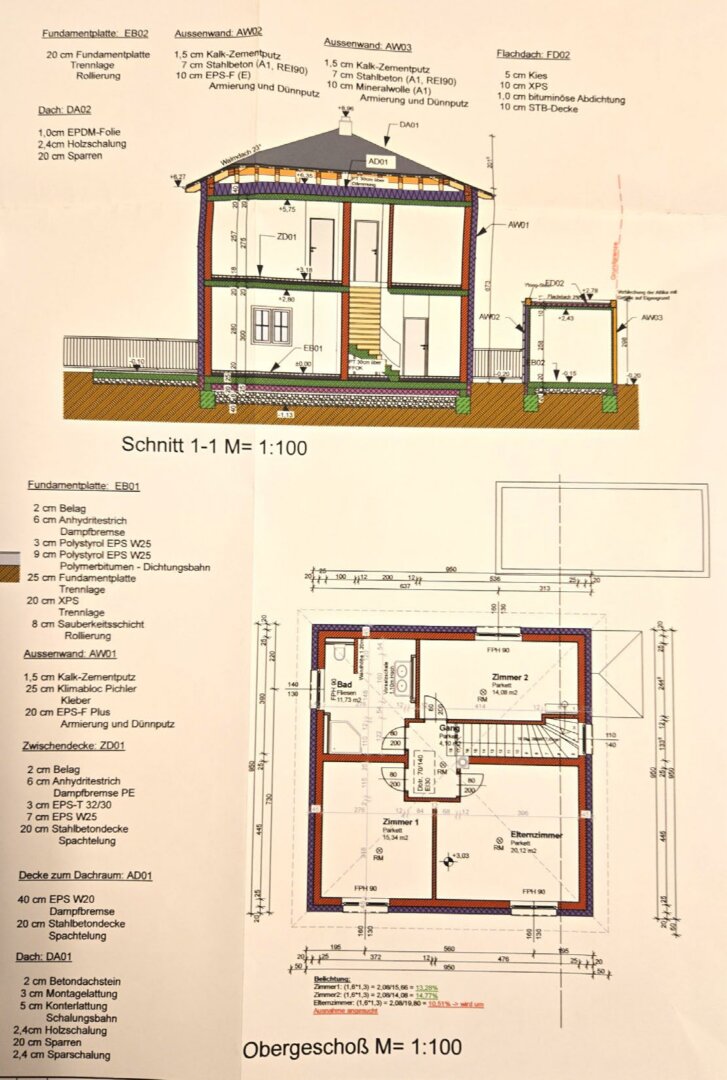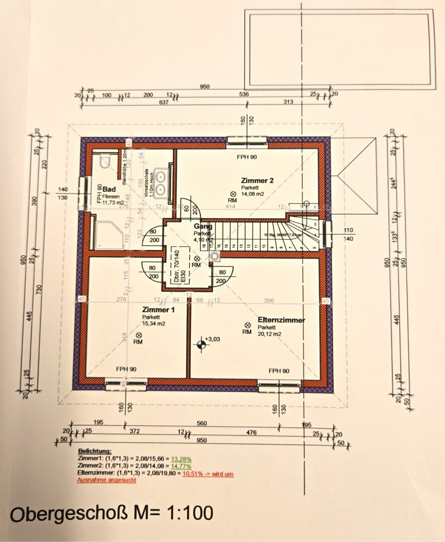 im Obergeschoß bestehend aus: Vorraum, Bad mit Dusche und WC, 3 Zimmer (zwischen 14m² – 20m²)
