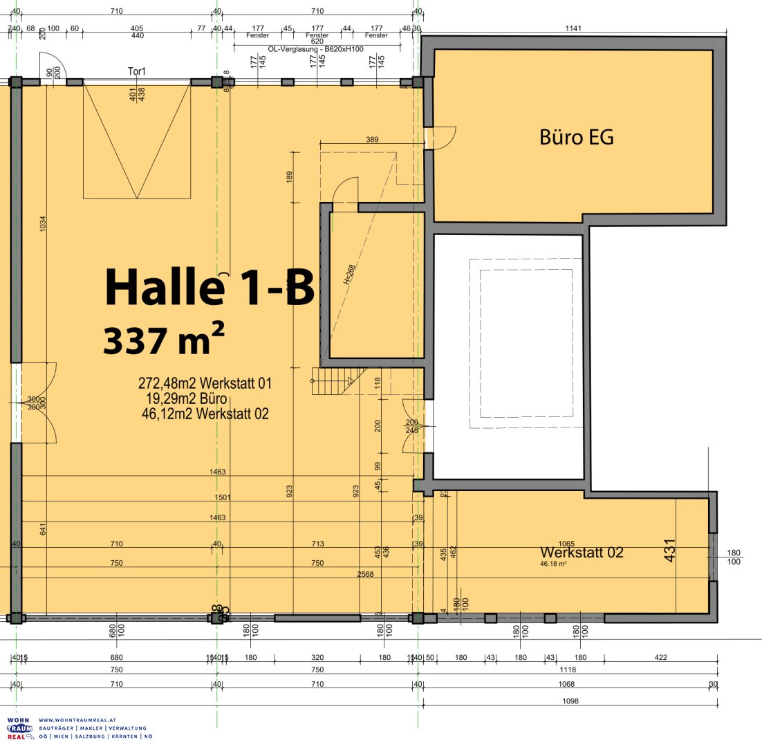 „Halle 1-B“ bietet eine Fläche von 318 m² ink. einem räumlich getrennten Bereich, der sich ebenfalls vielseitig nutzen lässt.