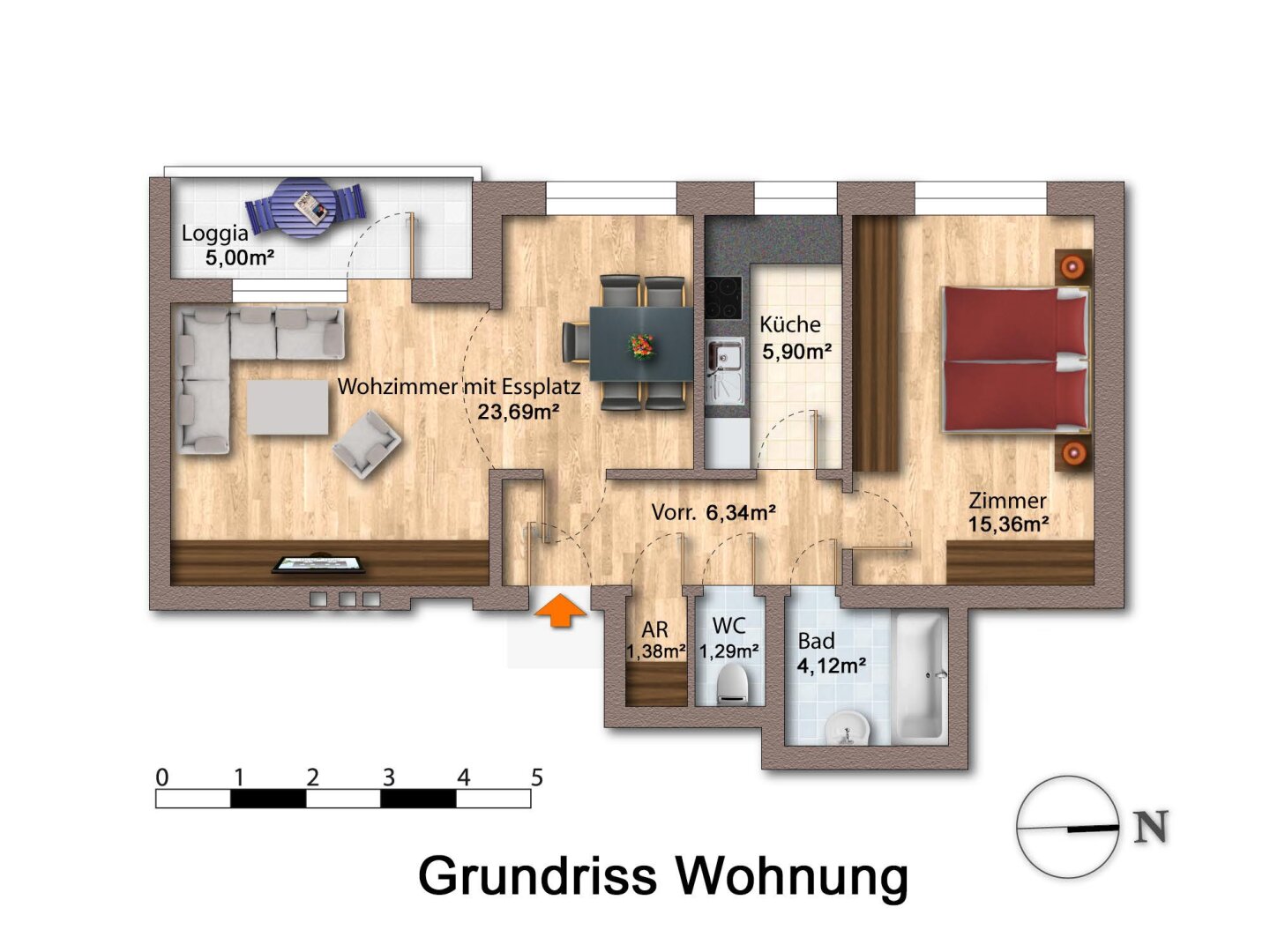 Die Wohnung bietet 63,08 m² Wohnfläche, einen durchdachten Grundriss und eine angenehm helle Atmosphäre.