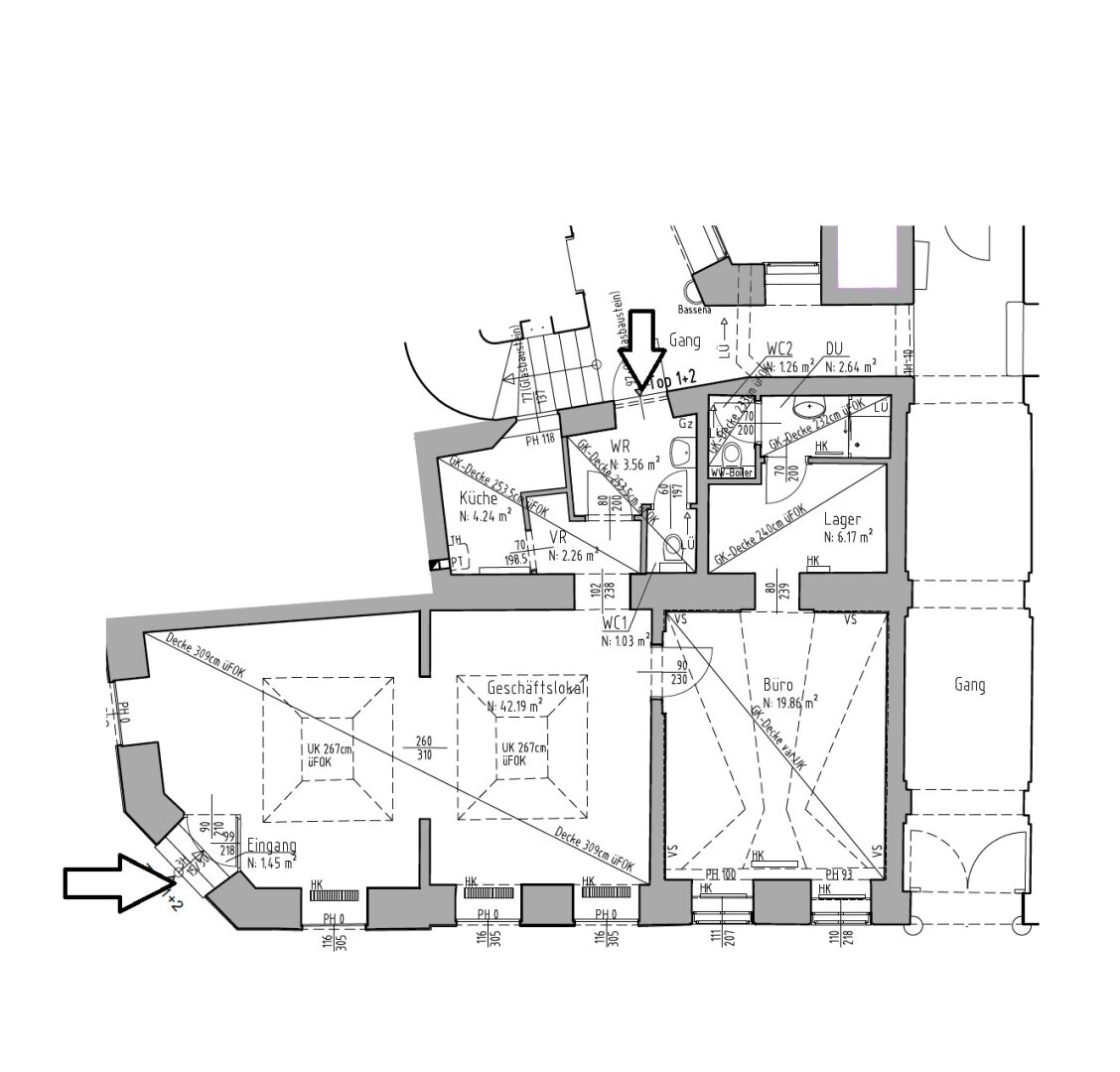 Herzstück der Einheit ist der ca. 43 m² große, lichtdurchflutete Verkaufsraum, der über einen direkten Straßenzugang verfügt und sich ideal für repräsentative Geschäftszwecke eignet. Ergänzt wird dieser Bereich