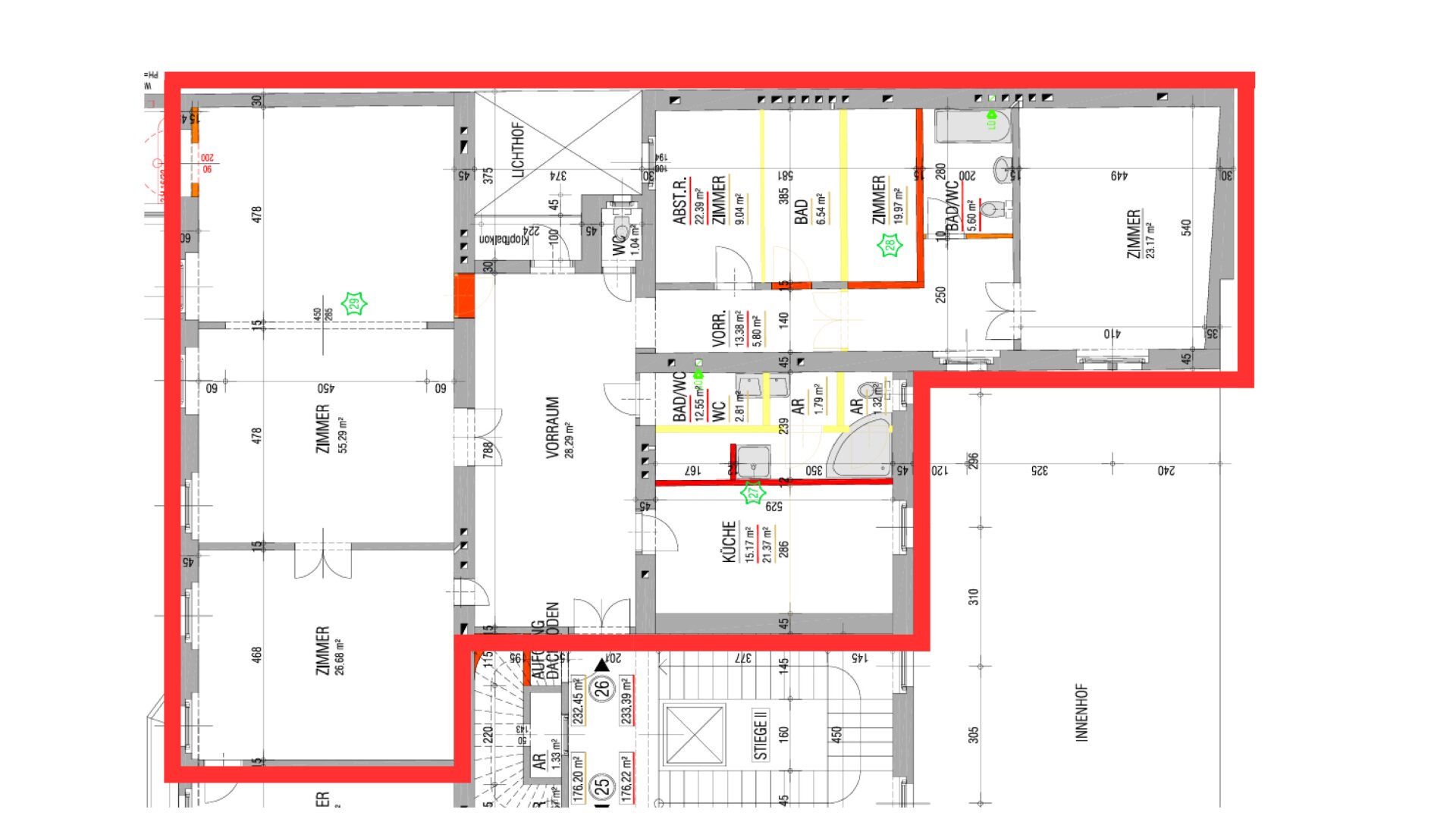 Zur Vermietung steht eine provisionsfreie Bürofläche im 4. Stock eines gepflegten Altbaus im 6. Bezirk, nur wenige Schritte vom Naschmarkt, der U-Bahn-Station Kettenbrückengasse und der Mariahilfer Straße entfernt. Die Einheit bietet eine klare, gut strukturierte Raumaufteilung mit mehreren einzeln begehbaren Zimmern, Balkon, zwei Badezimmern, separatem WC und zusätzlichen Räumen mit