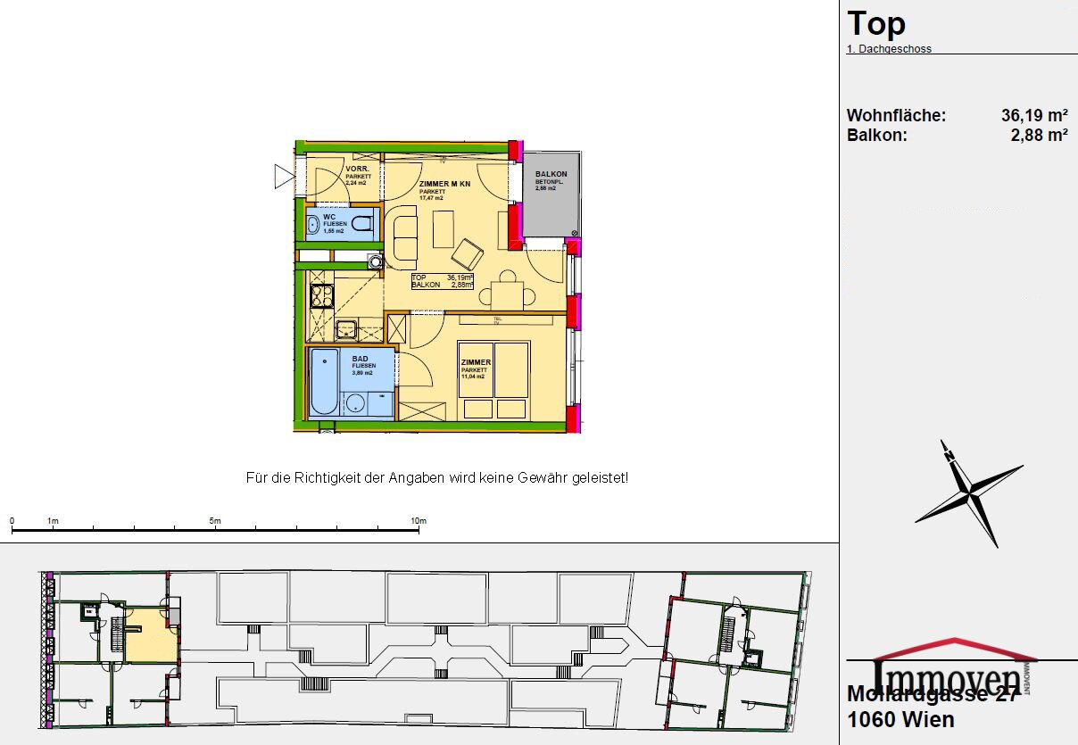 Die 2-Zimmerwohnung befindet sich im 1. Dachgeschoss (Lift vorhanden), bietet eine Nutzfläche von ca. 36 m² und einen Balkon.