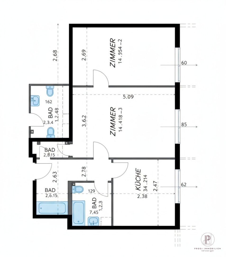 Die Wohnung verfügt über zwei Zimmer (davon ein Durchgangszimmer),