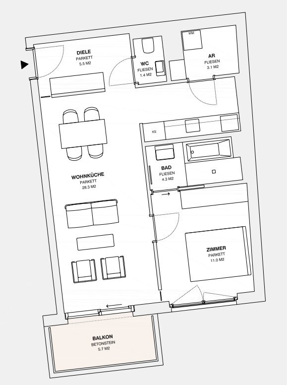 ++ Bei den hier dargestellten Fotos handelt es sich um ähnliche, bereits fertiggestellte Wohnungen des selben Projektentwicklers. Aktuelle Bilder des Projektes MOLLARD50 werden nächste Woche nachgereicht. Der dargestellte Plan/Grundriss ist der der tatsächlichen