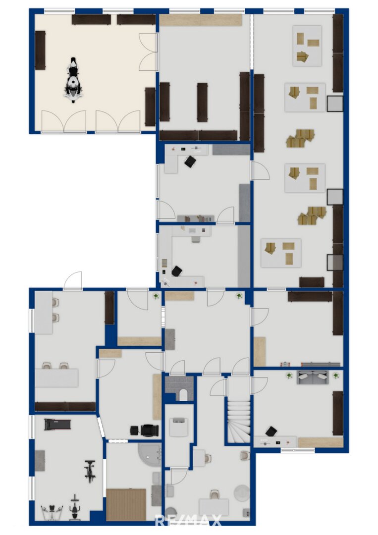 Im Erdgeschoss dieses Einfamilienhauses stehen ca. 238 m² Nutzfläche zur Verfügung. Diese gliedert sich in eine großzügige Werkstatt, 2 Büroräume sowie 6 Lagerräume.