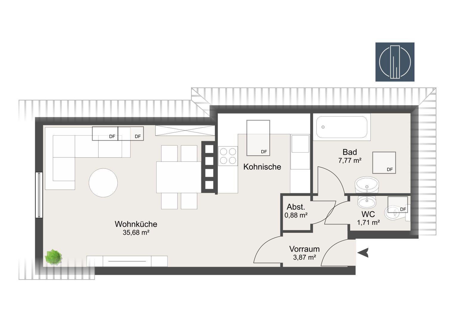 Mit einer Fläche von 50 m² und einem gut durchdachten Raumkonzept präsentiert sich diese 1-Zimmer-Wohnung als ideales