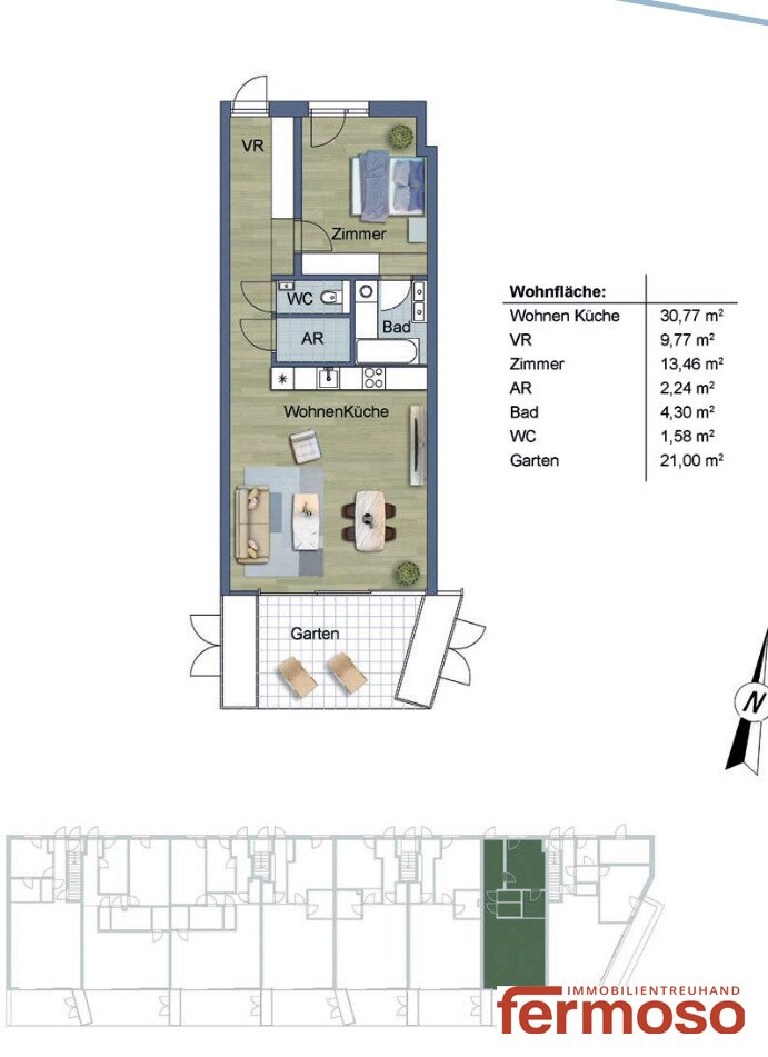 Diese ideal geschnittene 2-Zimmer-Gartenwohnung verbindet komfortables Wohnen mit einem schönen Außenbereich. Der Mittelpunkt ist die offene Wohnküche (ca. 30,77 m²) mit direktem Zugang in den privaten Garten (ca. 21,00 m²) – perfekt zum Entspannen, Sonnen oder für gemütliche Abende im Freien.