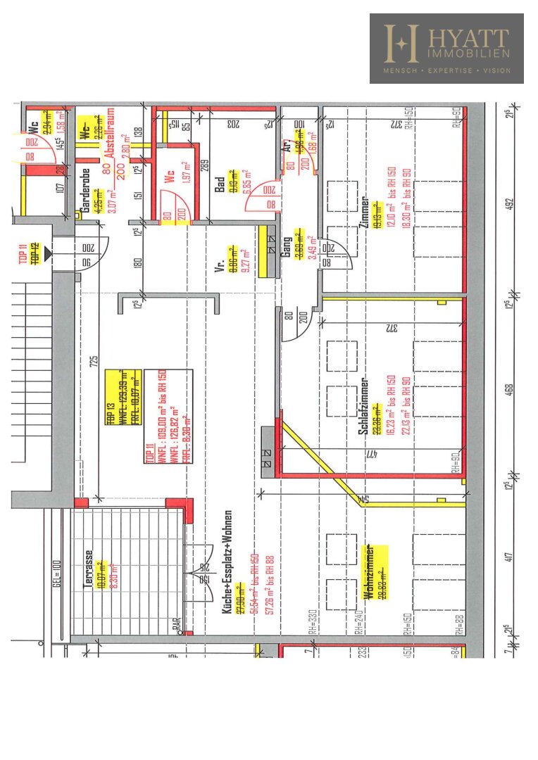 Man betritt die Wohnung über ein zentral gelegenes Vorzimmer mit rund 9,27 m², das eine einladende Eingangssituation schafft und den Zugang zu allen Bereichen der Wohnung ermöglicht. Rechterhand gelangt man in den großzügigen Wohn- und Küchenbereich, der laut Plan 57,26 m² umfasst und mit seiner offenen Struktur viel Raum für