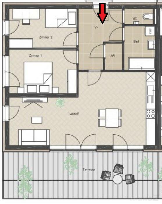 Vorraum, Bad, extra WC, Abstellraum, Wohnzimmer mit offener, möblierter Küche mit Ausgang auf die große Terrasse, 2 Zimmer. Alle Räume sind zentral vom Vorraum begehbar. Ein geräumiges Kellerabteil rundet das Angebot ab.In den Betriebskosten sind die Warmwasserkosten inkludiert. Für die Heizung ist ein gesonderter Vertrag abzuschließen. Ein Tiefgaragenplatz ist extra