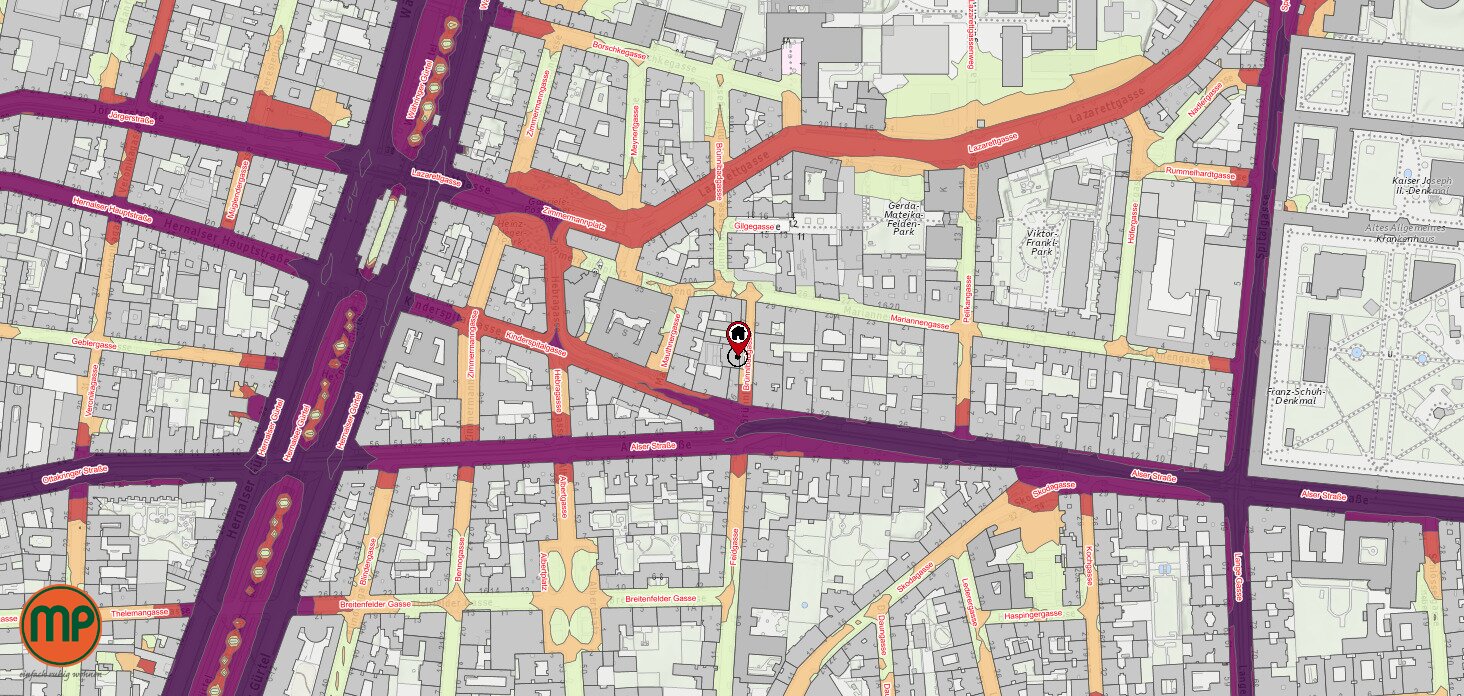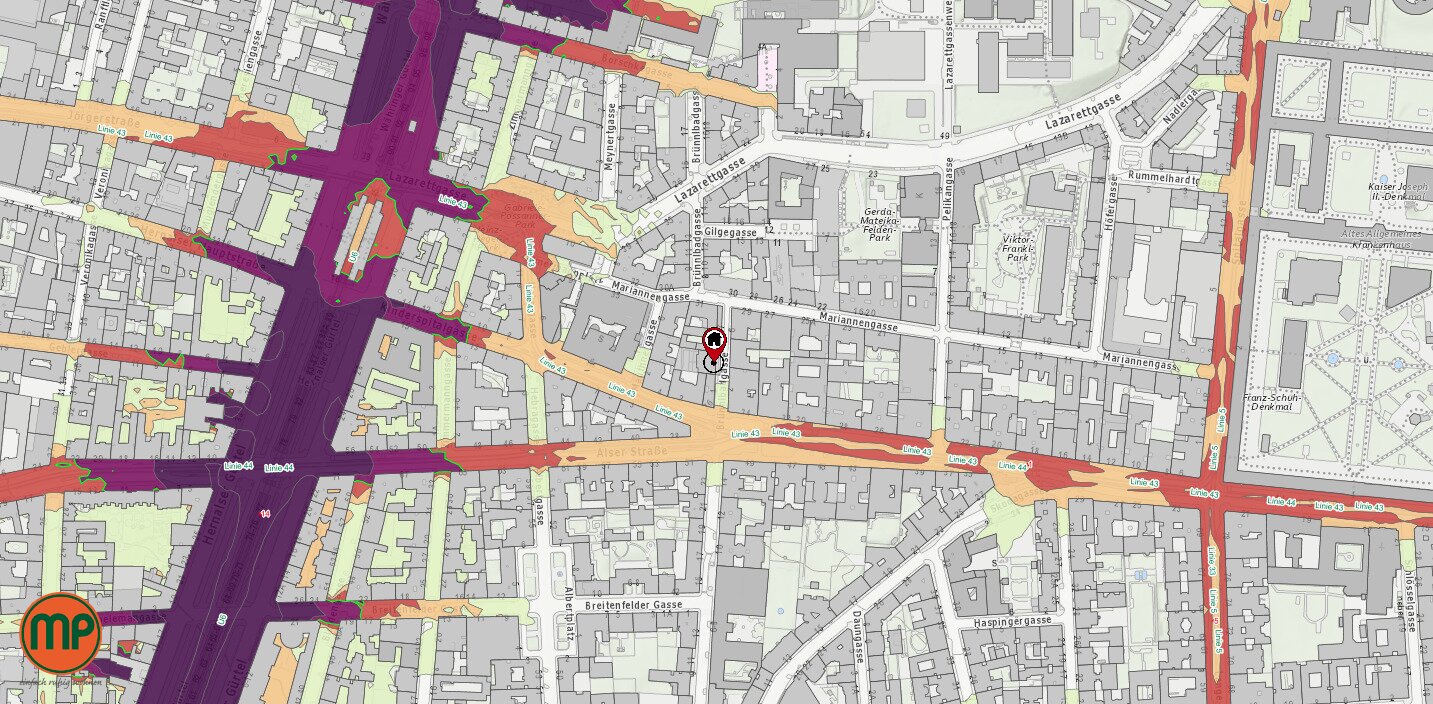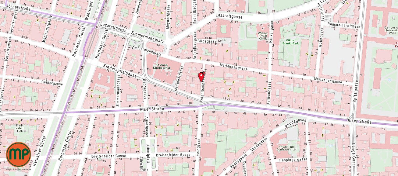 Zwischen U-Bahn-Station Alser Straße und altem AKH gelegen, ist man sowohl öffentlich (U6, 43, 44, 13A), als auch mit Auto (B221) bestens angebunden.