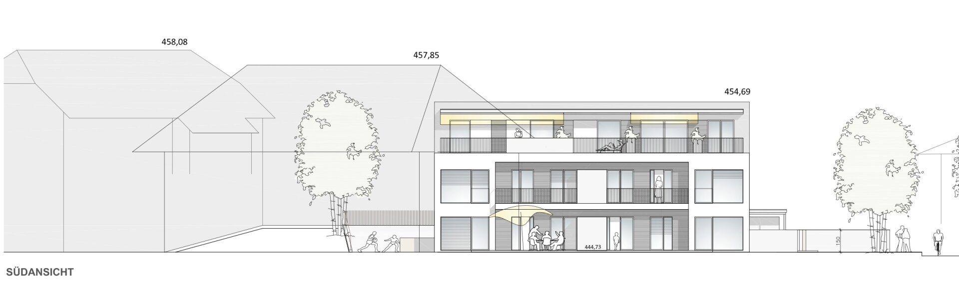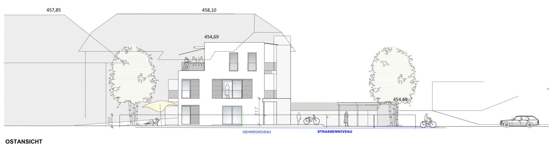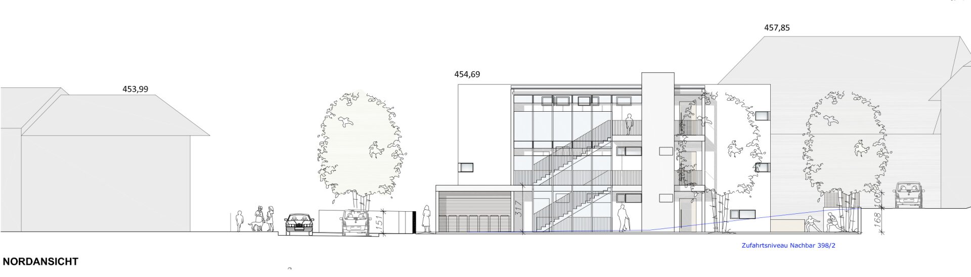 Errichtet werden 5 hochwertige Eigentumswohnungen, aufgeteilt auf drei Ebenen, mit Wohnflächen von rund 78 m2 bis 119 m2, wahlweise mit südwestlicher