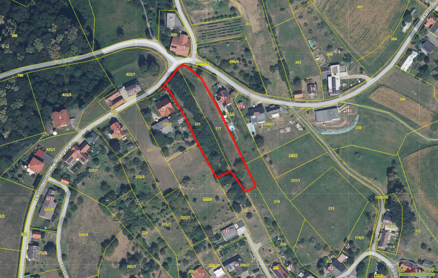 Die beiden nebeneinanderliegenden Grundstücke umfassen insgesamt ca. 3.712 m² Grundfläche. Davon sind rund 1.860 m² als Bauland „WA – Allgemeines Wohngebiet“ mit einer Bebauungsdichte von 0,2–0,4 gewidmet, während die restliche Fläche als Freiland ausgewiesen ist. Zusätzlich besteht eine ausgearbeitete Planung für ein Wohnhaus mit vier Einheiten.