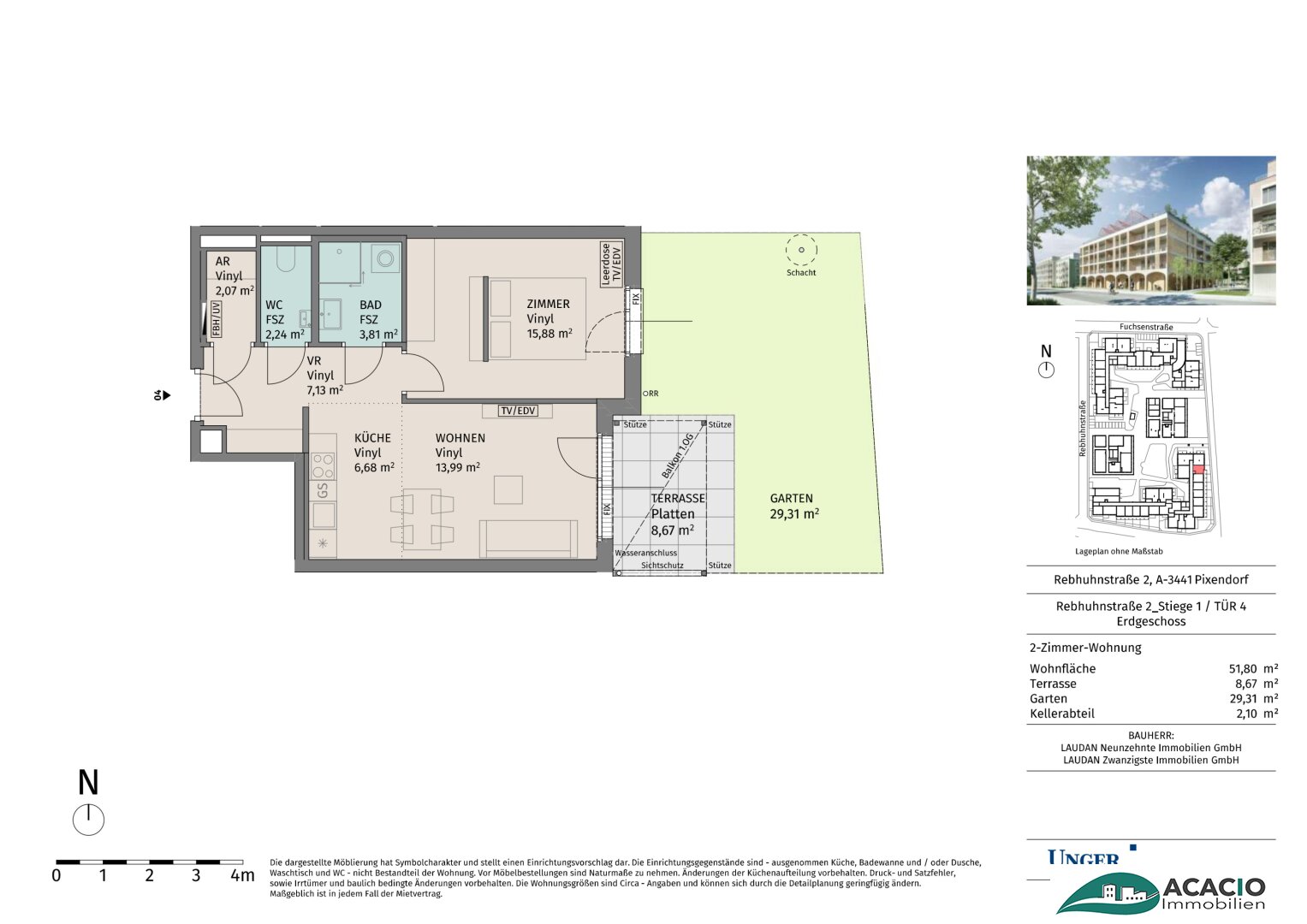 Diese topmoderne Wohnung im Erdgeschoß mit ca. 51,8m² Wohnfläche und ostseitigem Garten verfügt über eine überdachte Terrasse mit Weitblick ins Grüne.