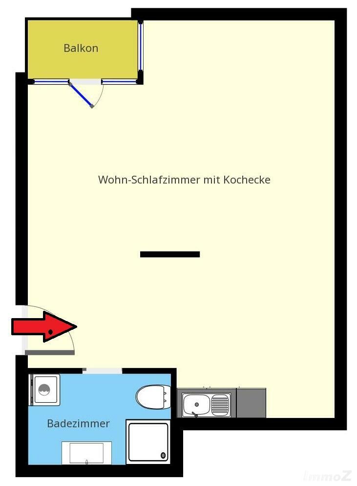 Vorraum, Dusche/WC, Wohnschlafraum mit Kochecke, Balkon, Kellerabteil.