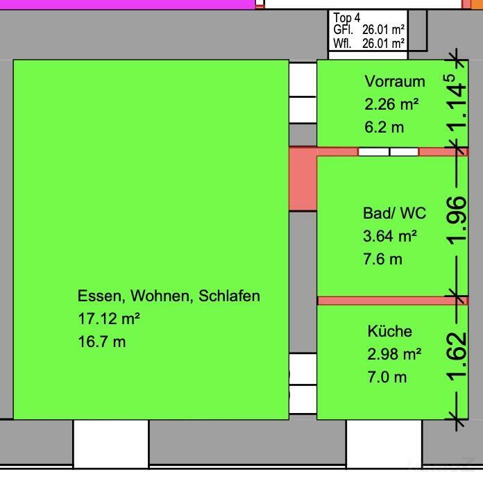 Die Top 10 befindet sich im 3 Obergeschoss und wird über das Stiegenhaus erreicht. Die Wohnung betritt man direkt in den Vorraum. Über diesen gelangt man in das Zimmer sowie das Bad welches ein WC, Dusche, Waschbecken und WM-Anschluss bietet. Die neu möblierte Küche ist vom Zimmer aus begehbar.