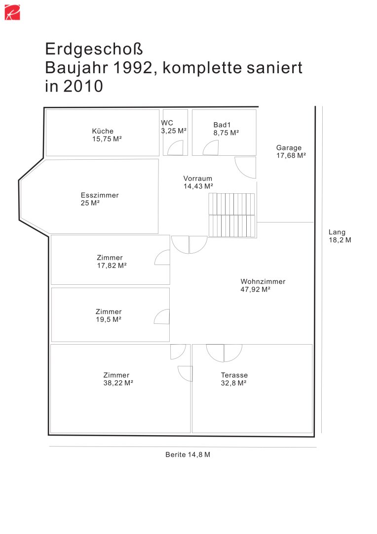 Das Haus wurde in Ziegelmassivbauweise 1992 errichtet, 2011 wurde das ganze Obergeschoss ausgebaut. Es bietet mit 10 Zimmern, 440 m² Wohnfläche und zusätzlicher 300 m² Kellerfläche (teilweise sehr große Fenster und überall hohe Räume) Platz ohne Ende und daher auch
