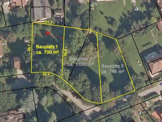 Das leicht nach Norden abfallende Grundstück ist Nord-Süd ausgerichtet und befindet sich in einer Einbahnstraße in einer ruhigen und grünen Wohngegend, dennoch zentral gelegen und unweit der Grenze zu Tullnerbach. Es resultiert aus einer Neuparzellierung, wobei ausschließlich der Bauplatz 1 zum Kauf angeboten wird. Im Zuge der Teilung wurde die Parzelle