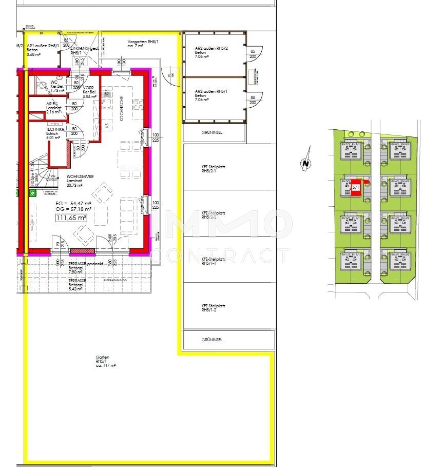 Die Erschließung der Reihenhäuser erfolgt über überdachte Eingangsbereiche, welche mit einem Außenabstellraum kombiniert sind.