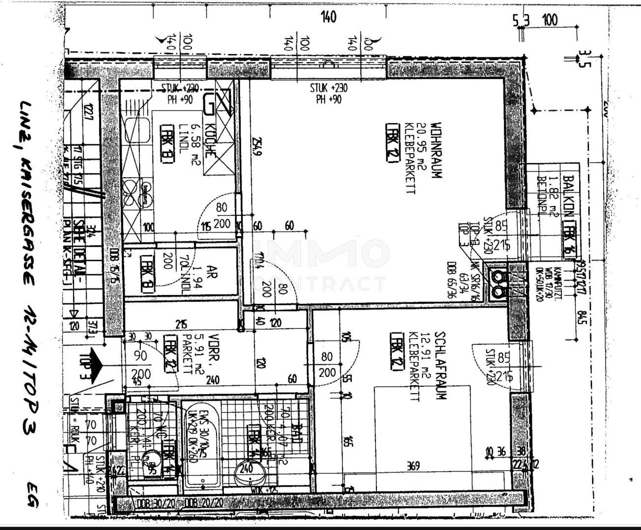 Raumaufteilung: Vorraum, Bad, WC, Schlafzimmer, Küche mit Speis, Wohn- Esszimmer, Balkon