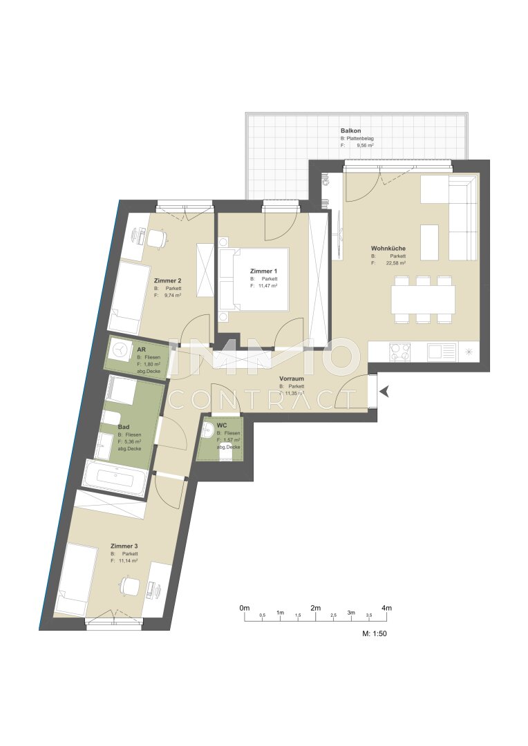 Diese durchdachte Vierzimmer-Wohnung mit einladendem Balkon in den begrünten Innenhof wird Sie begeistern! Sie gliedert sich in eine Wohnküche und ein Elternschlafzimmer, von denen aus der Balkon begehbar ist. Zwei Kinder- bzw. Arbeitszimmer, ein Badezimmer mit Dusche, Badewanne, Toilette sowie ein Abstellraum und separates Gäste-WC komplettieren diesen besonderen Grundriss.